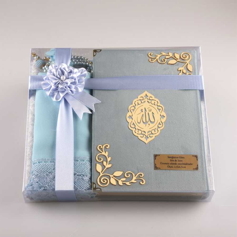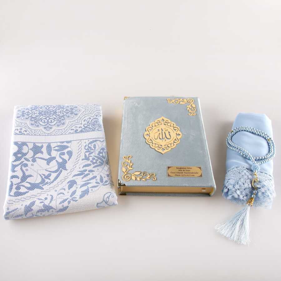 Şal + Seccade + Tesbih + Kuran Hediye Seti (Çanta Boy, Kadife, Açık Mavi, Lafzatullah)