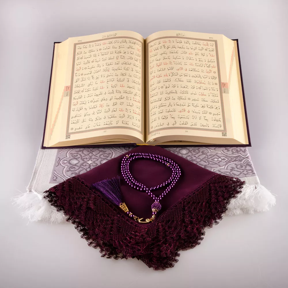 Şal + Seccade + Tesbih + Kuran Hediye Seti (Hafız Boy, Ekonomik Cilt, Mor)