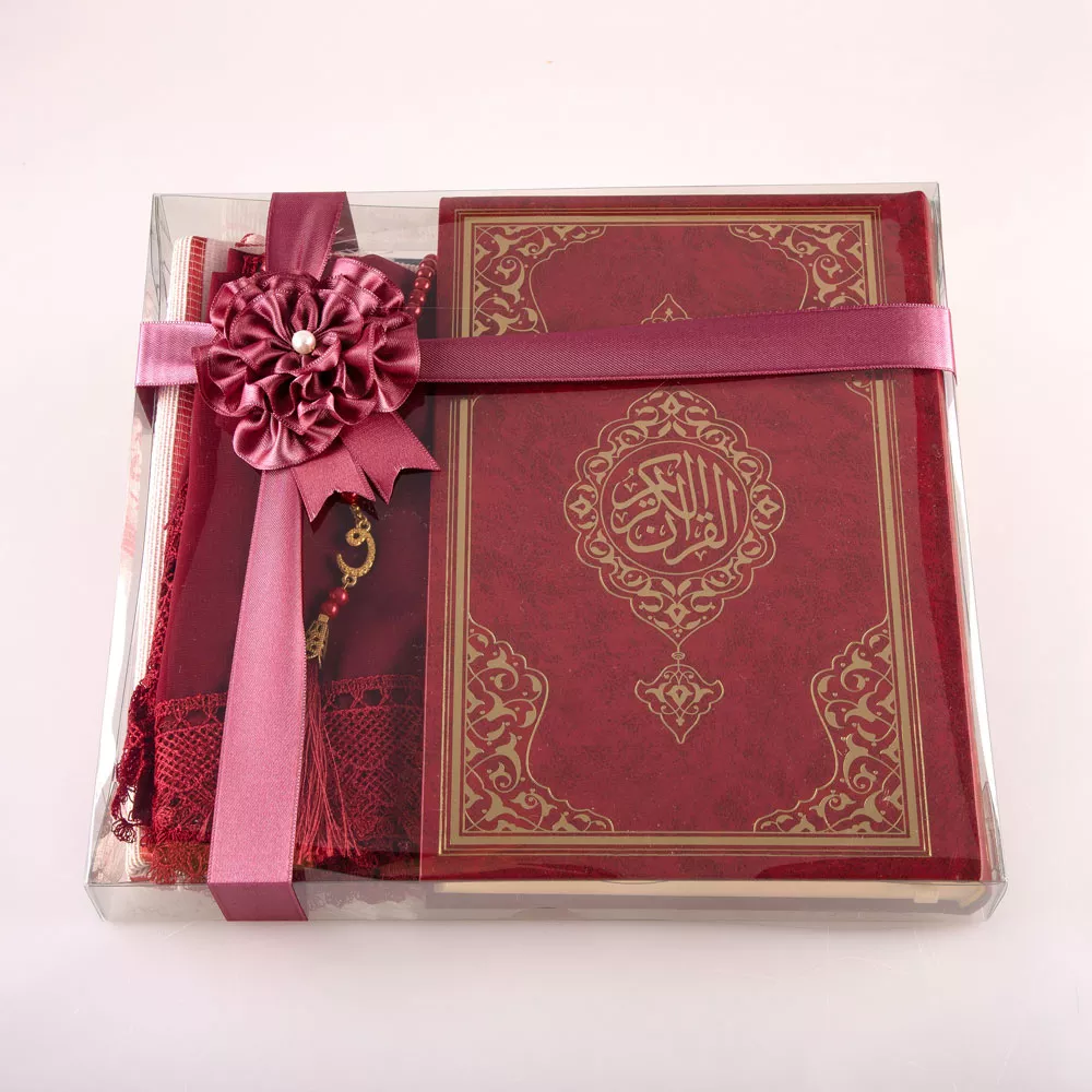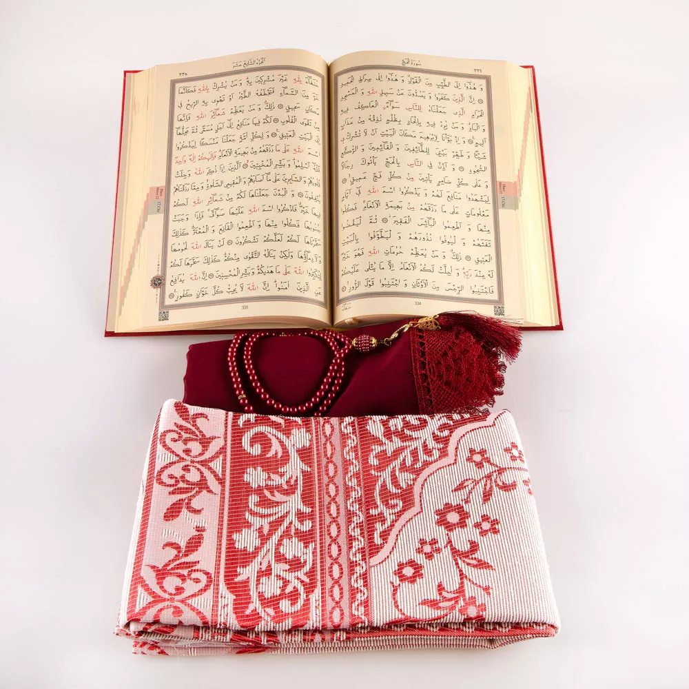 Şal + Seccade + Tesbih + Kuran Hediye Seti (Orta Boy, Ekonomik Cilt, Bordo)
