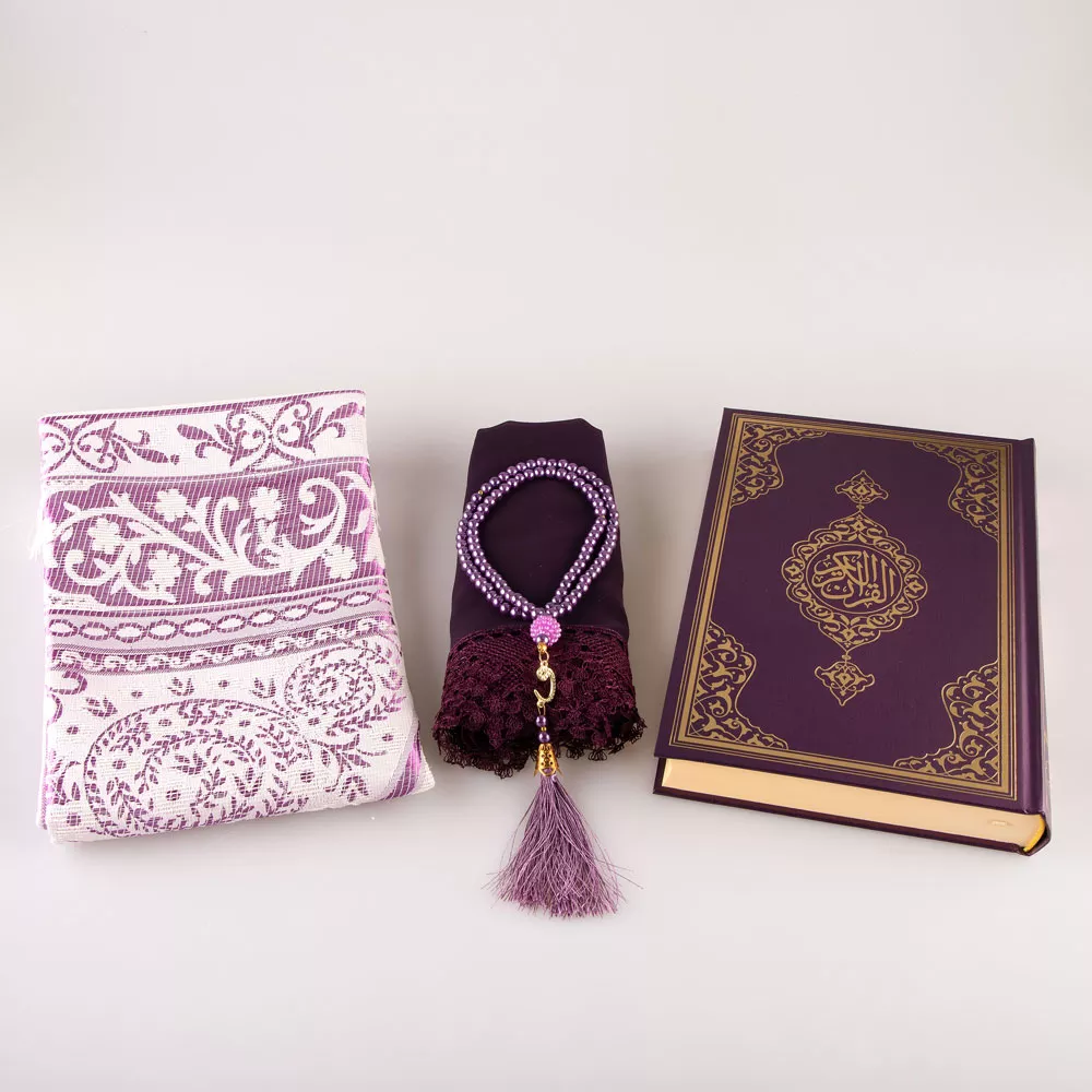 Şal + Seccade + Tesbih + Kuran Hediye Seti (Orta Boy, Ekonomik Cilt, Mor)