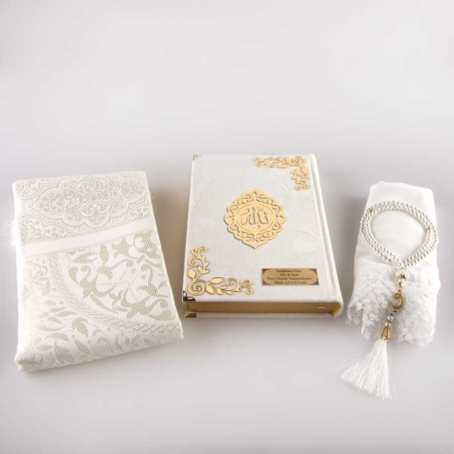 Şal + Seccade + Tesbih + Kuran Hediye Seti (Orta Boy, Kadife, Beyaz, Lafzatullah)