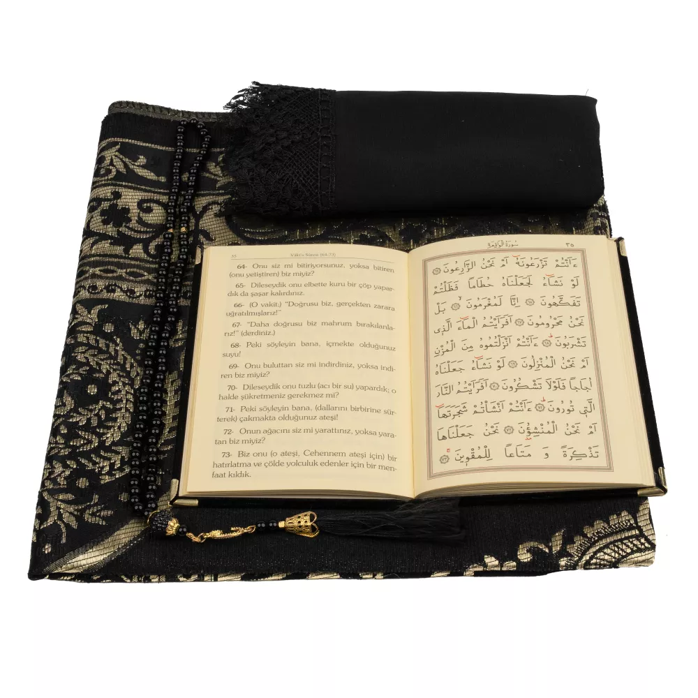 Şal + Seccade + Tesbih + Yasin Hediye Seti (Çanta Boy, Şems Lafzatullah, Raşel Cilt, Siyah)