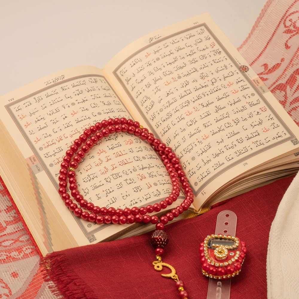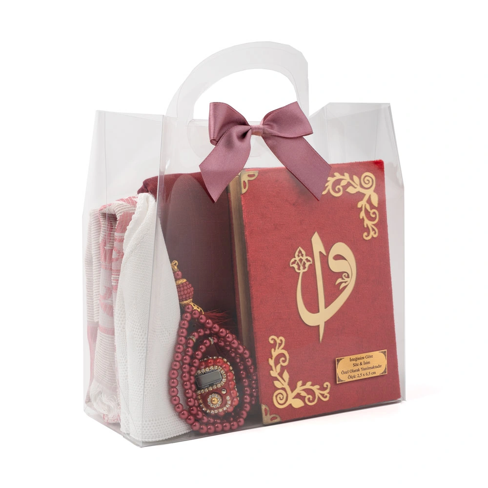 Eşarp + Takke + Seccade + Tesbih + Zikirmatik + Kuran Hediye Seti (Çanta Boy, Bordo)