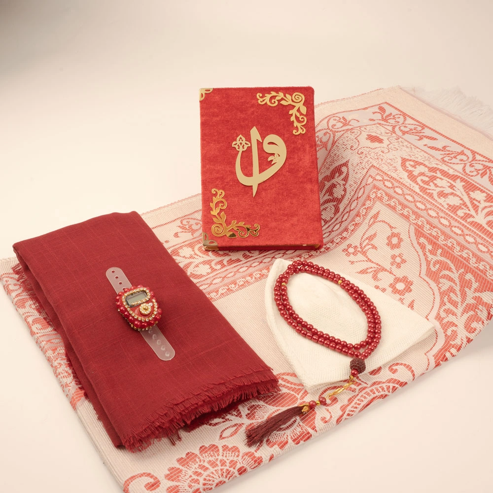 Şal + Takke + Seccade + Tesbih + Zikirmatik + Kuran Hediye Seti (Çanta Boy, Bordo)