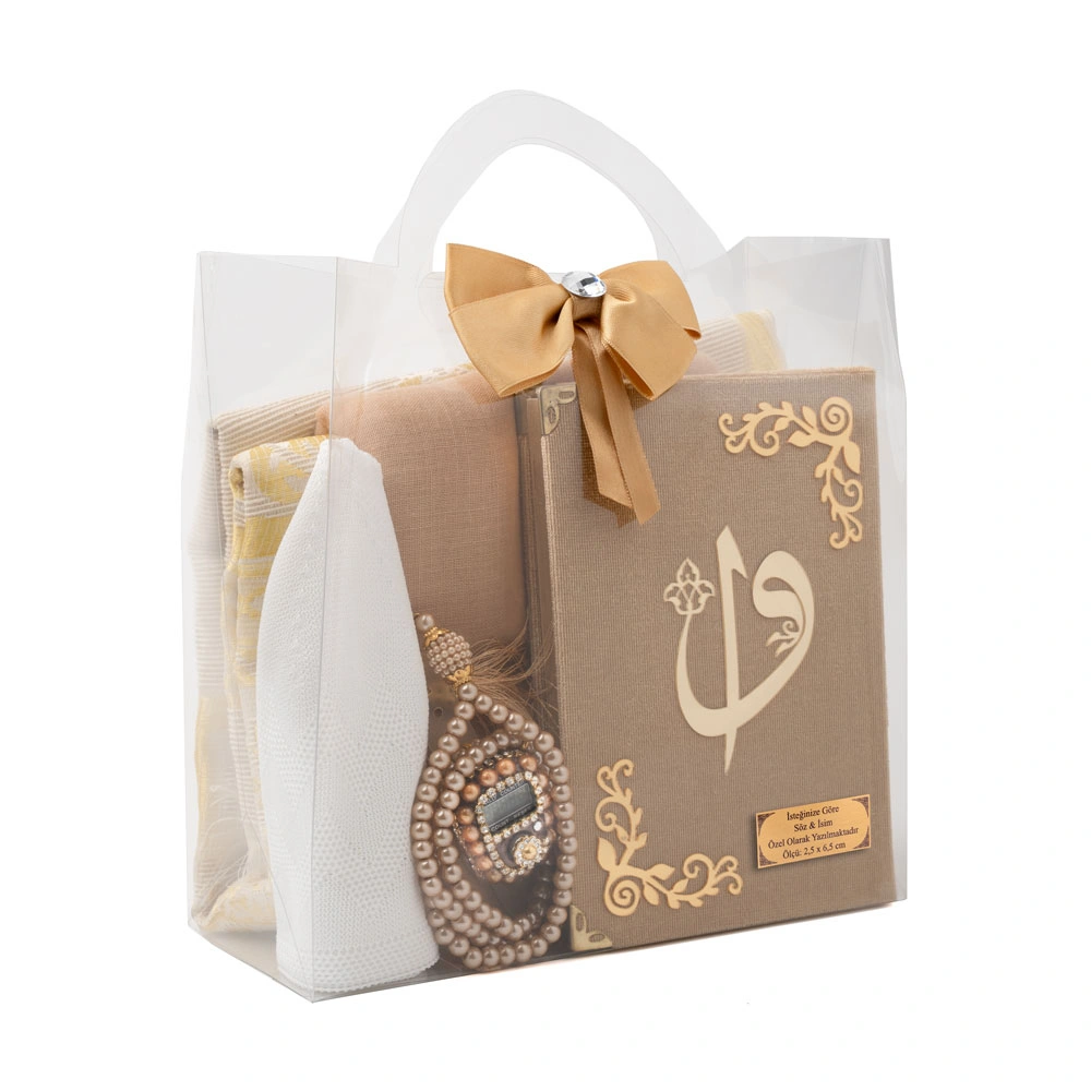 Eşarp + Takke + Seccade + Tesbih + Zikirmatik + Kuran Hediye Seti (Çanta Boy, Gold)