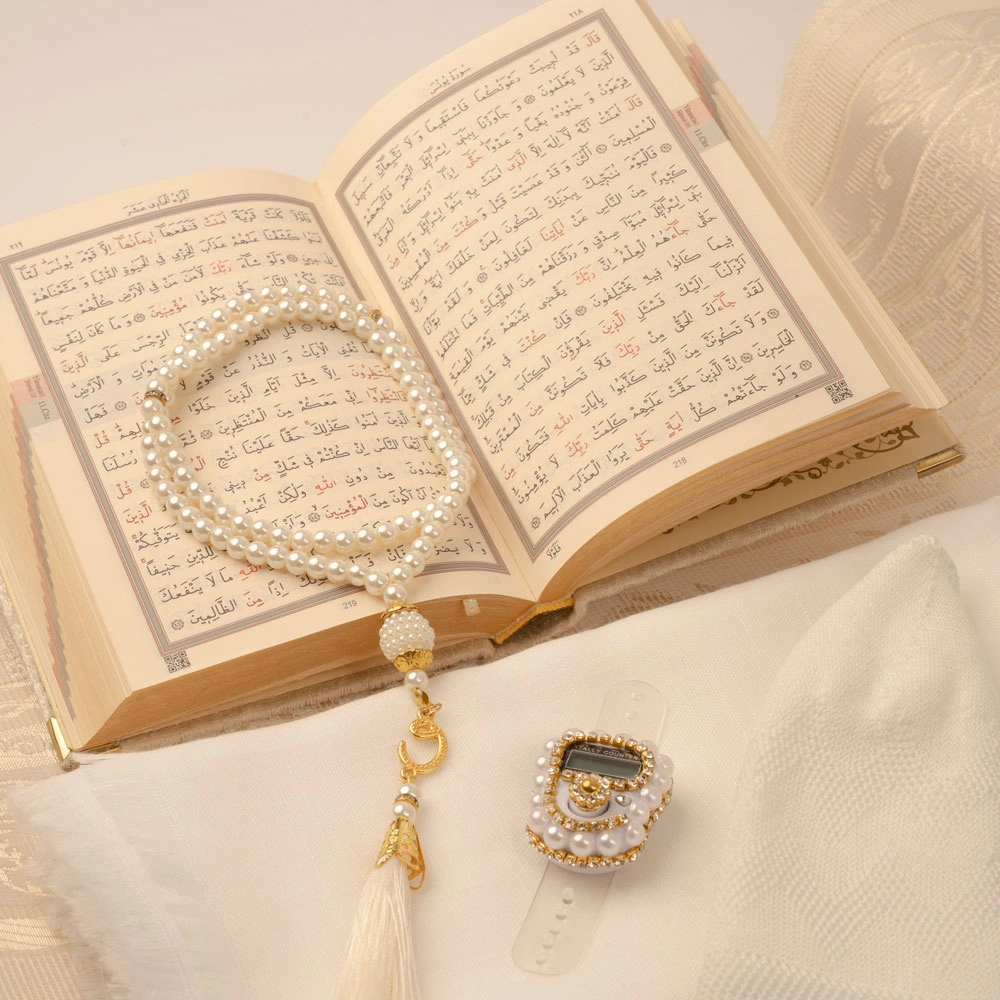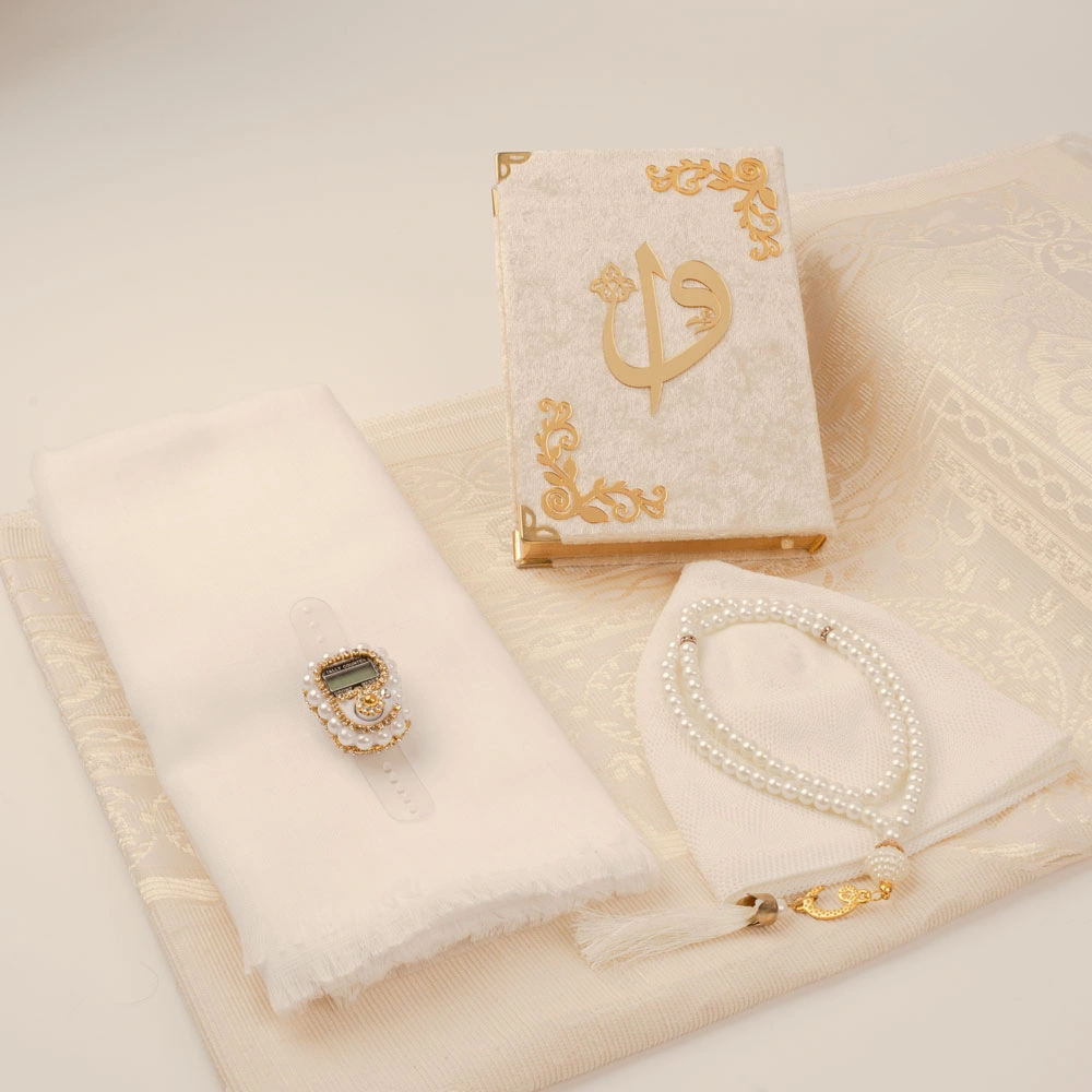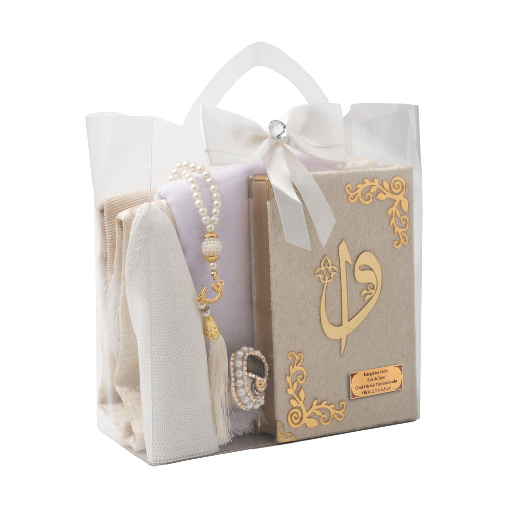 Eşarp + Takke + Seccade + Tesbih + Zikirmatik + Kuran Hediye Seti (Çanta Boy, Krem)