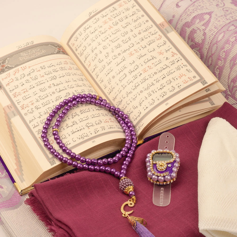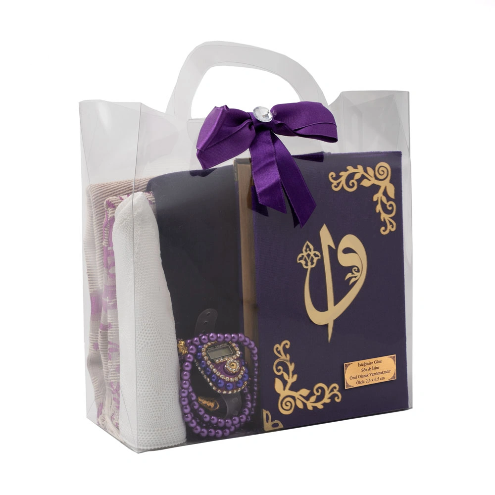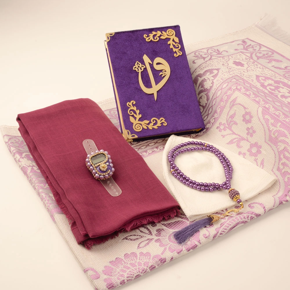 Eşarp + Takke + Seccade + Tesbih + Zikirmatik + Kuran Hediye Seti (Çanta Boy, Mor)