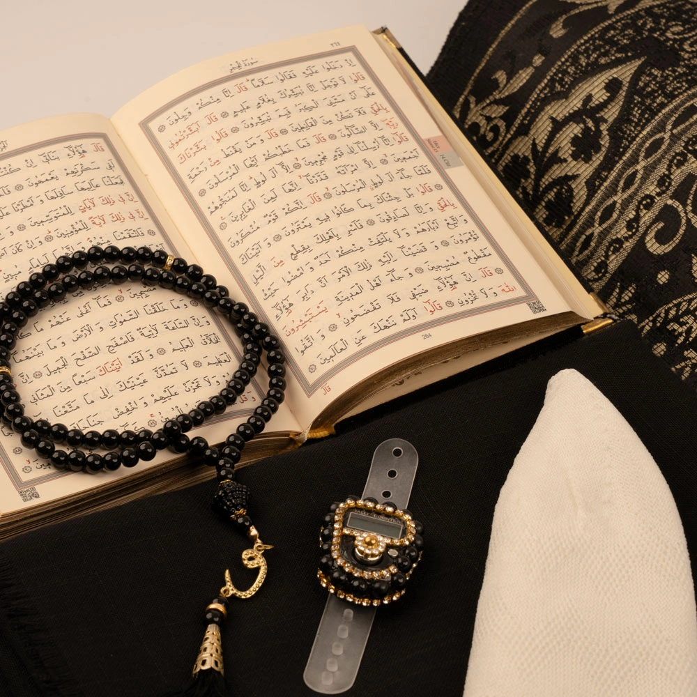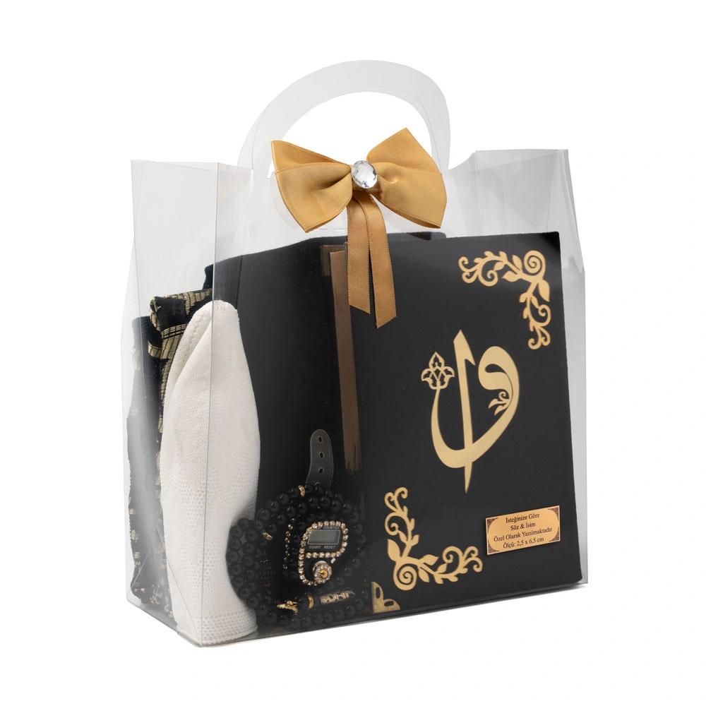 Eşarp + Takke + Seccade + Tesbih + Zikirmatik + Kuran Hediye Seti (Çanta Boy, Siyah)
