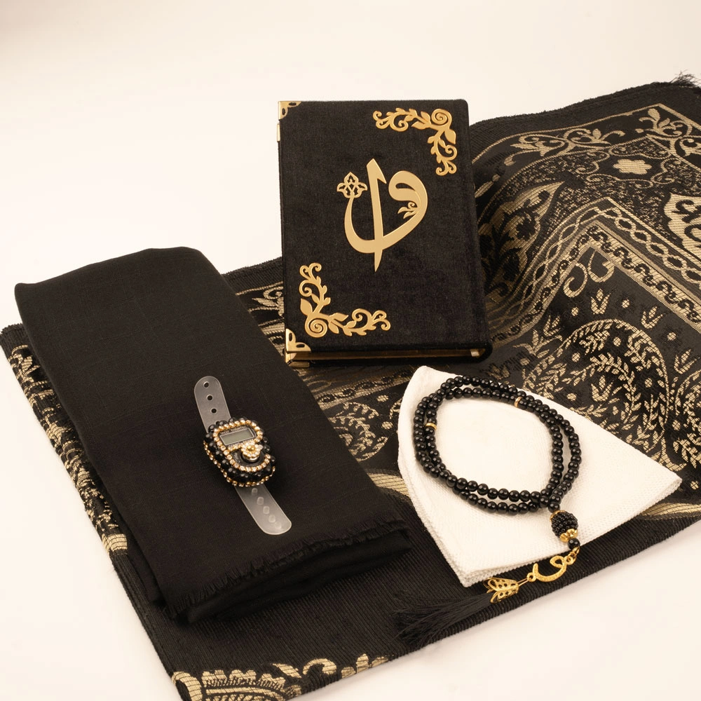 Şal + Takke + Seccade + Tesbih + Zikirmatik + Kuran Hediye Seti (Çanta Boy, Siyah)