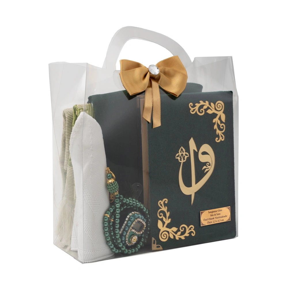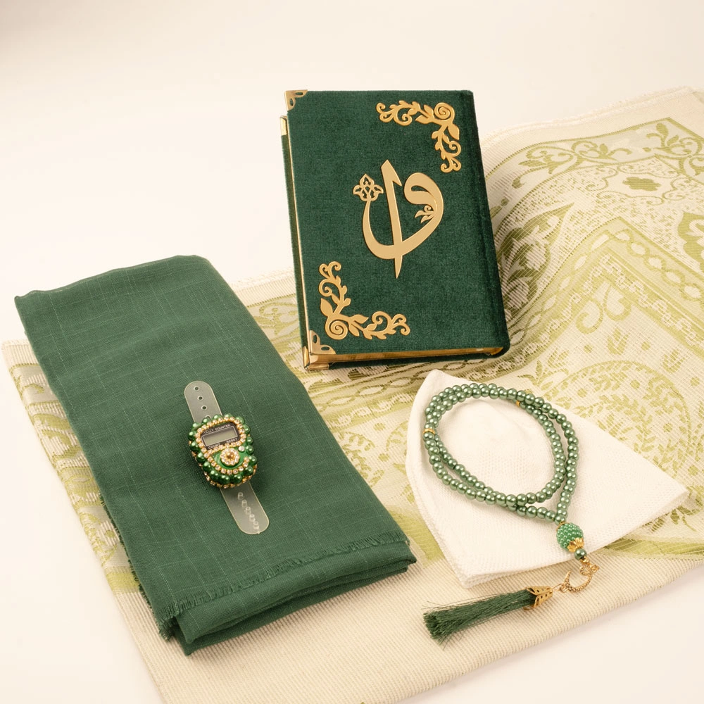 Eşarp + Takke + Seccade + Tesbih + Zikirmatik + Kuran Hediye Seti (Çanta Boy, Yeşil)