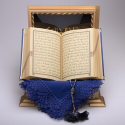 Şal + Tesbih + Kuran Hediye Seti (Hafız Boy, Ahşap Kutulu, Kadife, Lacivert)