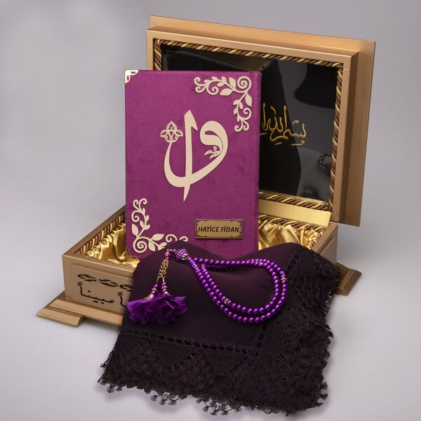 Şal + Tesbih + Kuran Hediye Seti (Hafız Boy, Ahşap Kutulu, Kadife, Mor)