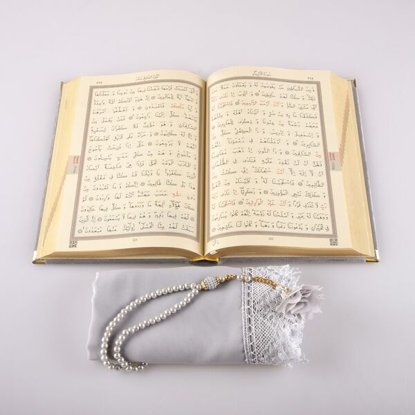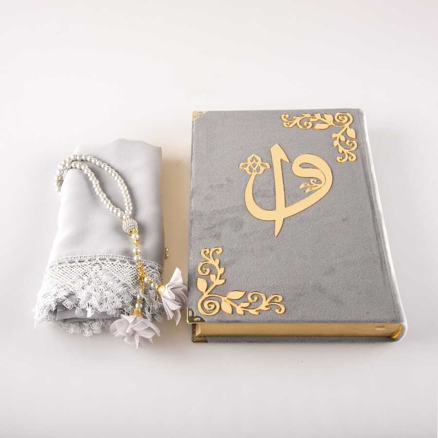 Shawl + Salah Beads + Quran Gift Set (Hafiz Size, Velvet, Grey)
