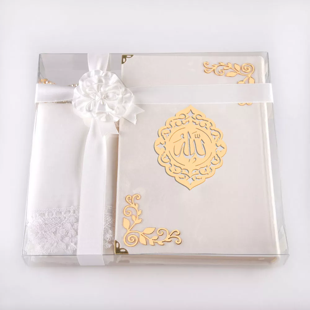 Şal + Tesbih + Kuran Hediye Seti (Hafız Boy, Kadife, Şems Lafzatullah, Beyaz)