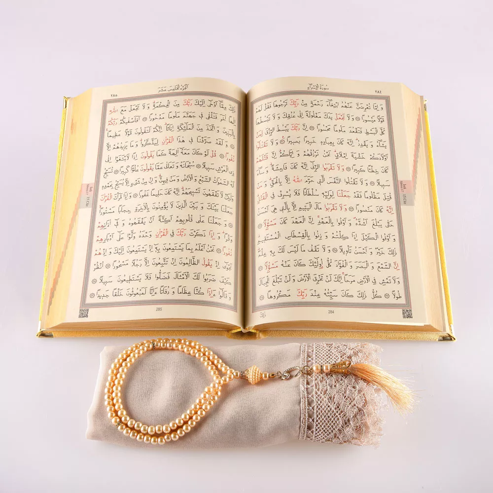 Şal + Tesbih + Kuran Hediye Seti (Hafız Boy, Kadife, Şems Lafzatullah, Gold)