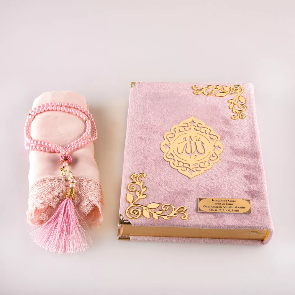 Şal + Tesbih + Kuran Hediye Seti (Orta Boy, Kadife, Lafzatullah, Pudra Pembe)