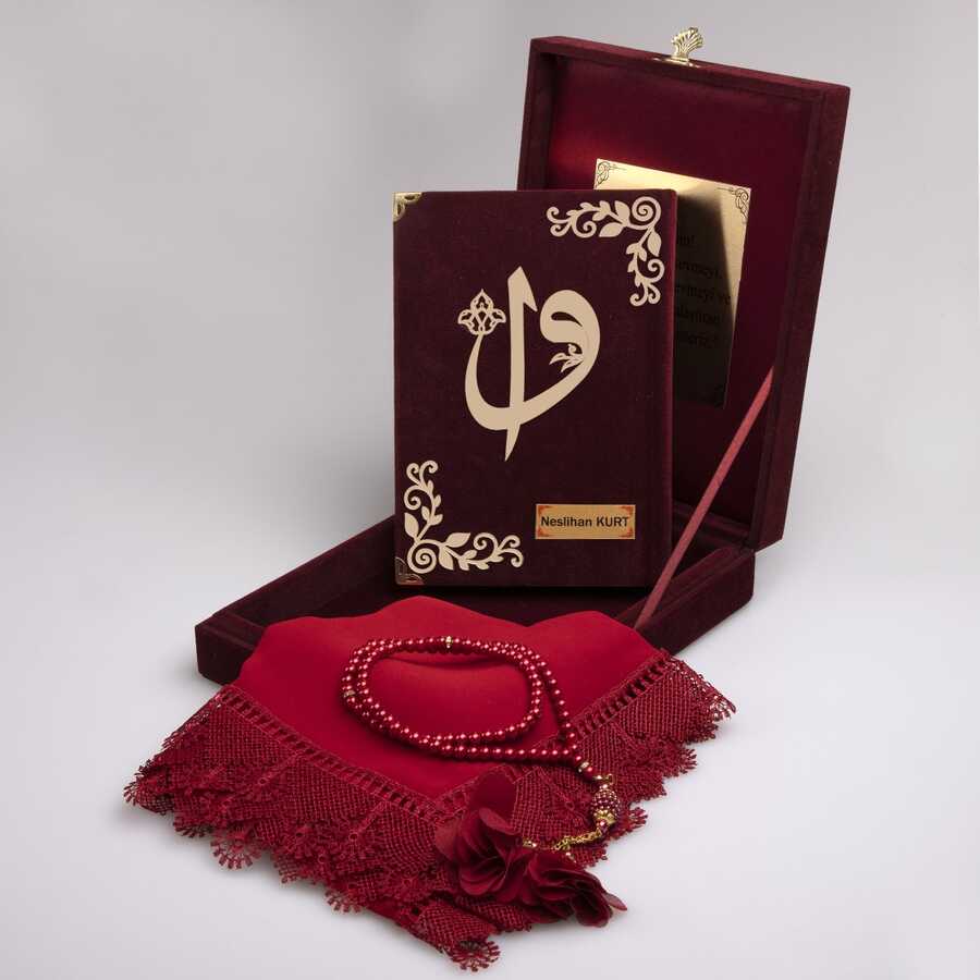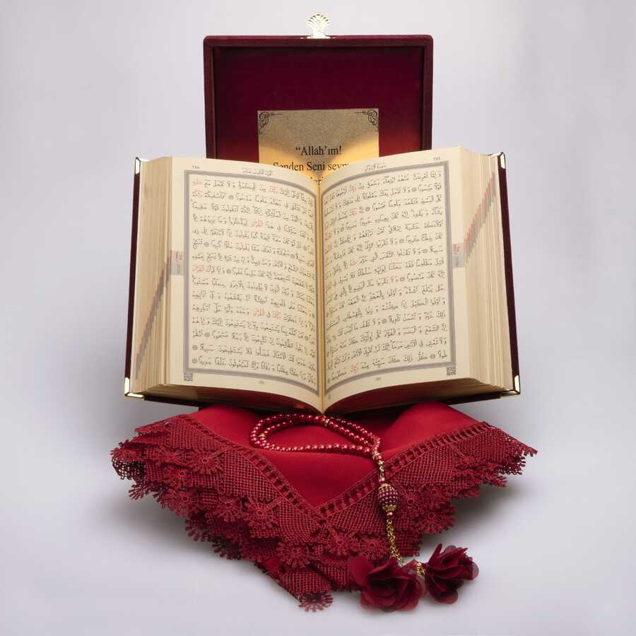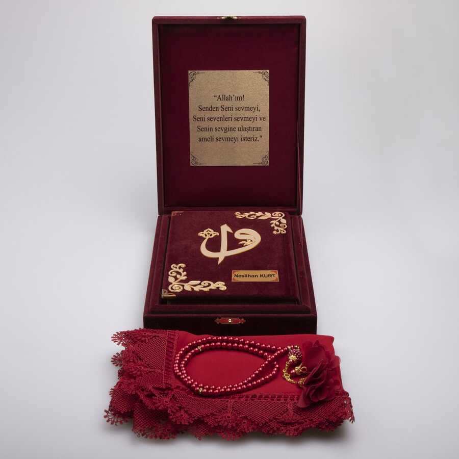 Şal + Tesbih + Kuran Hediye Seti (Rahle Boy, Plaket Kutulu, Bordo)