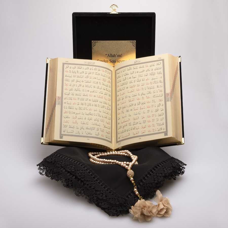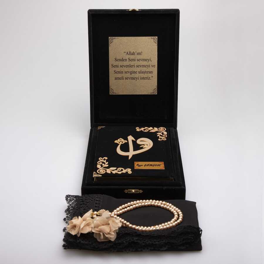 Şal + Tesbih + Kuran Hediye Seti (Rahle Boy, Plaket Kutulu, Siyah)