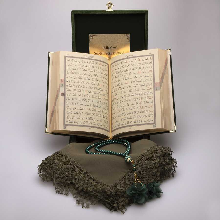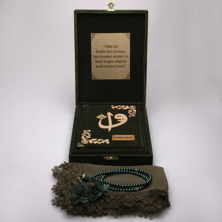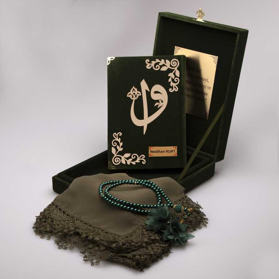 Şal + Tesbih + Kuran Hediye Seti (Rahle Boy, Plaket Kutulu, Yeşil)