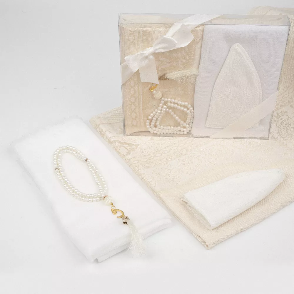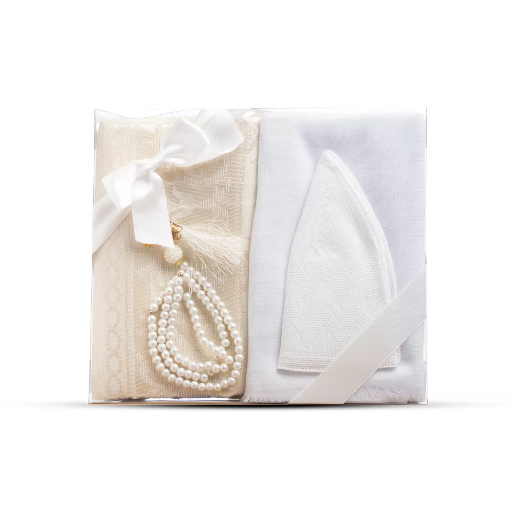 Seccade + Eşarp + Takke + Tesbih Hediye Seti (Asetat Kutulu, Beyaz)