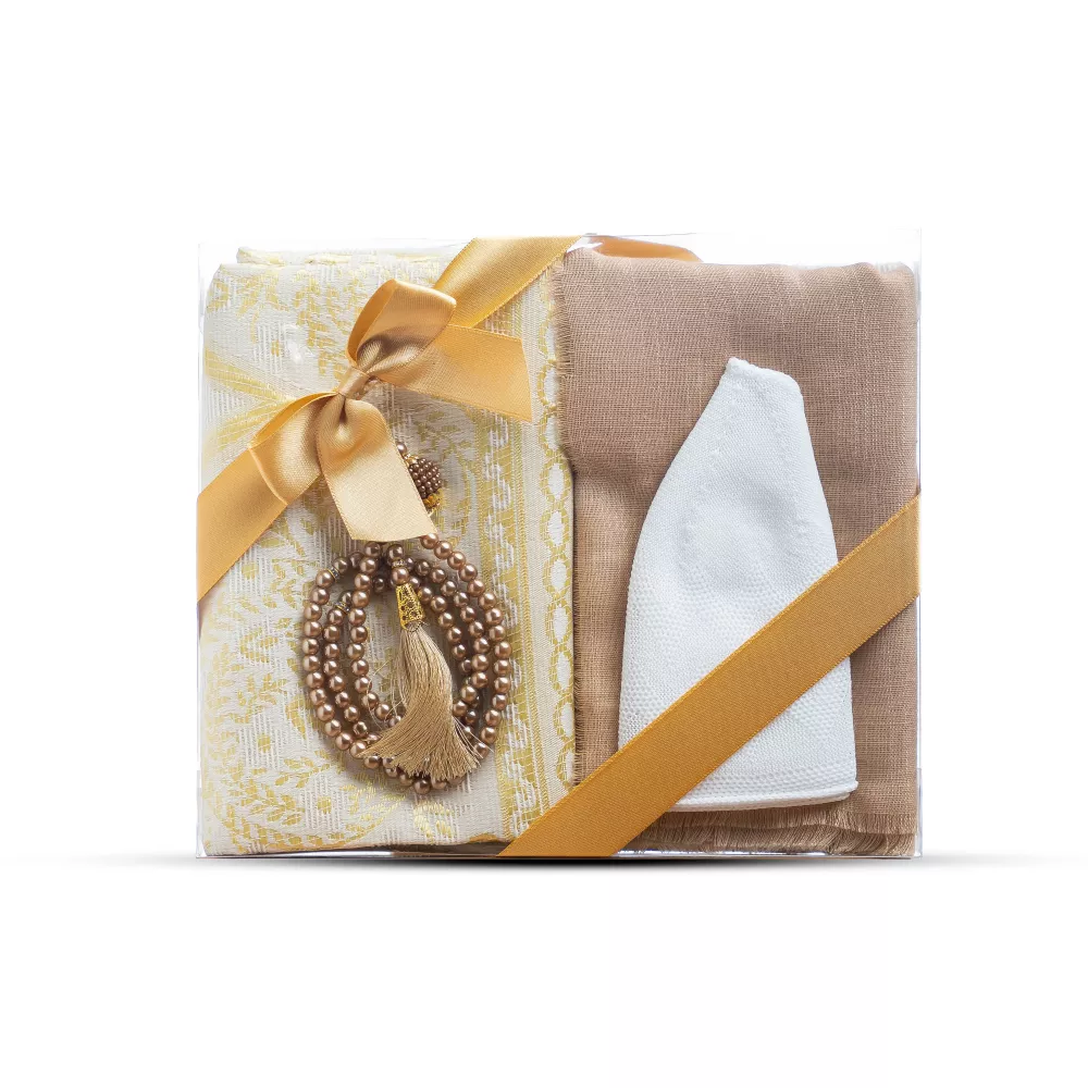 Seccade + Eşarp + Takke + Tesbih Hediye Seti (Asetat Kutulu, Gold)