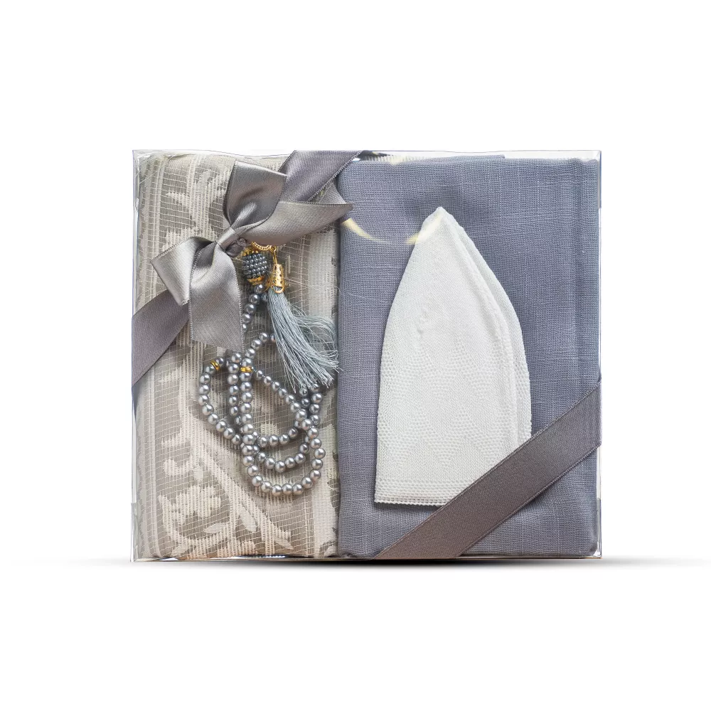 Seccade + Eşarp + Takke + Tesbih Hediye Seti (Asetat Kutulu, Gri)