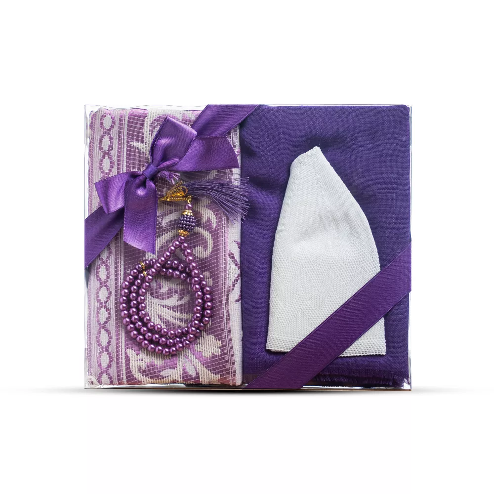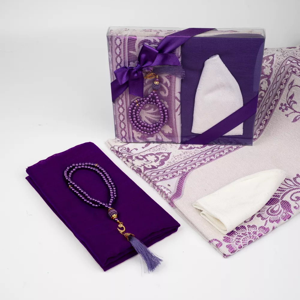 Seccade + Eşarp + Takke + Tesbih Hediye Seti (Asetat Kutulu, Mor)
