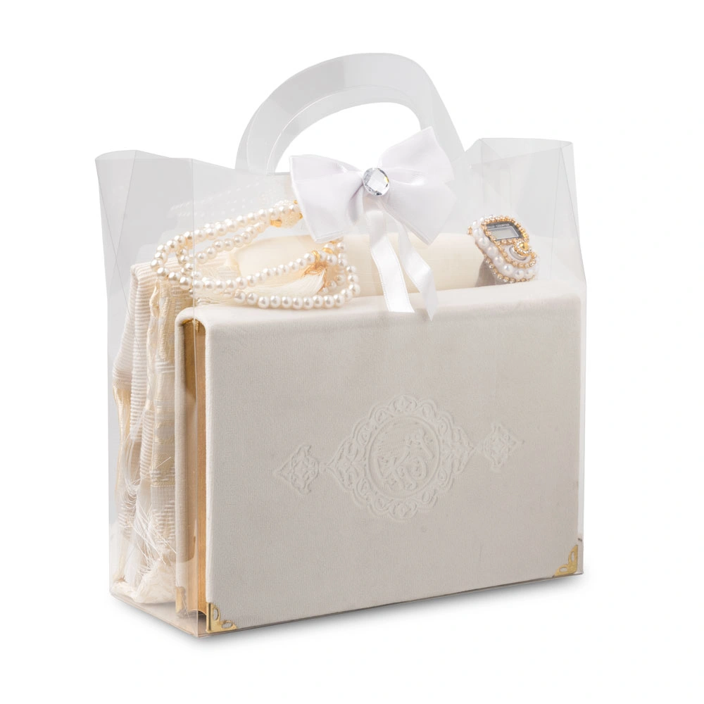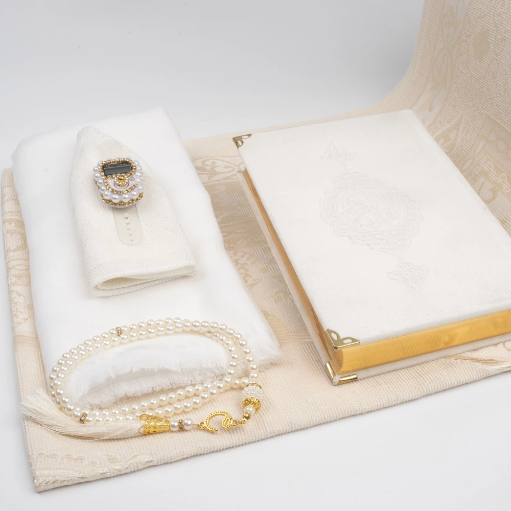 Seccade + Eşarp + Takke + Zikirmatik + Tesbih + Hafız Boy Kuran Hediye Seti (Soğuk Baskı, Beyaz)