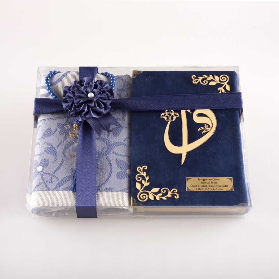 Seccade + Tesbih + Kuran Hediye Seti (Çanta Boy, Kadife, Lacivert)