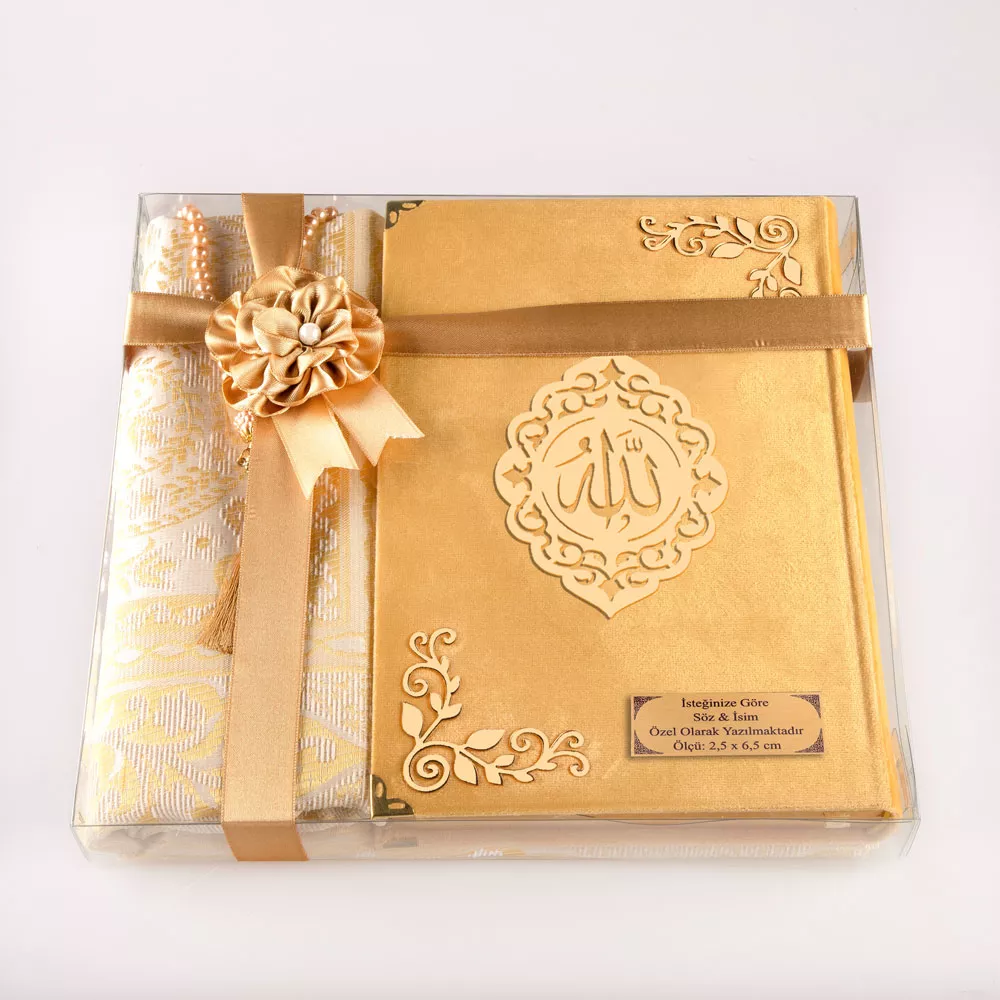 Seccade + Tesbih + Kuran Hediye Seti (Çanta Boy, Kadife, Gold, Lafzatullah)