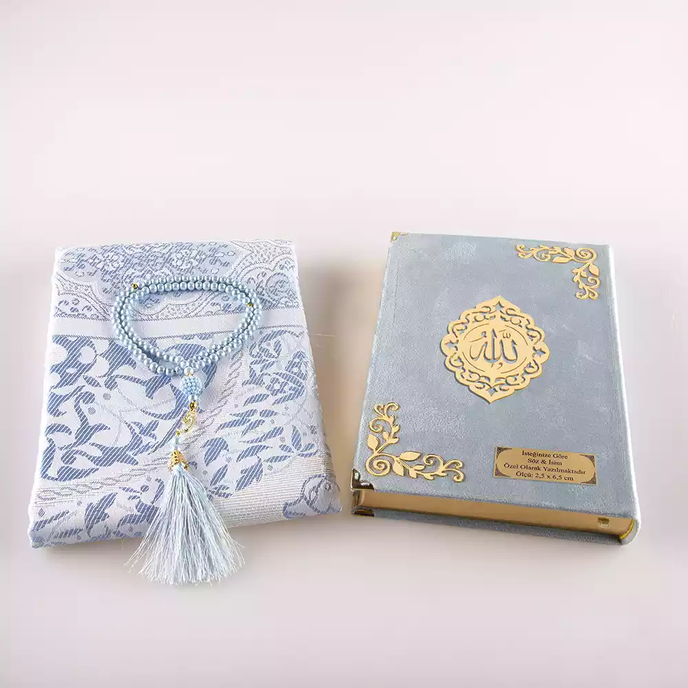 Seccade + Tesbih + Kuran Hediye Seti (Orta Boy, Kadife, Açık Mavi, Lafzatullah)