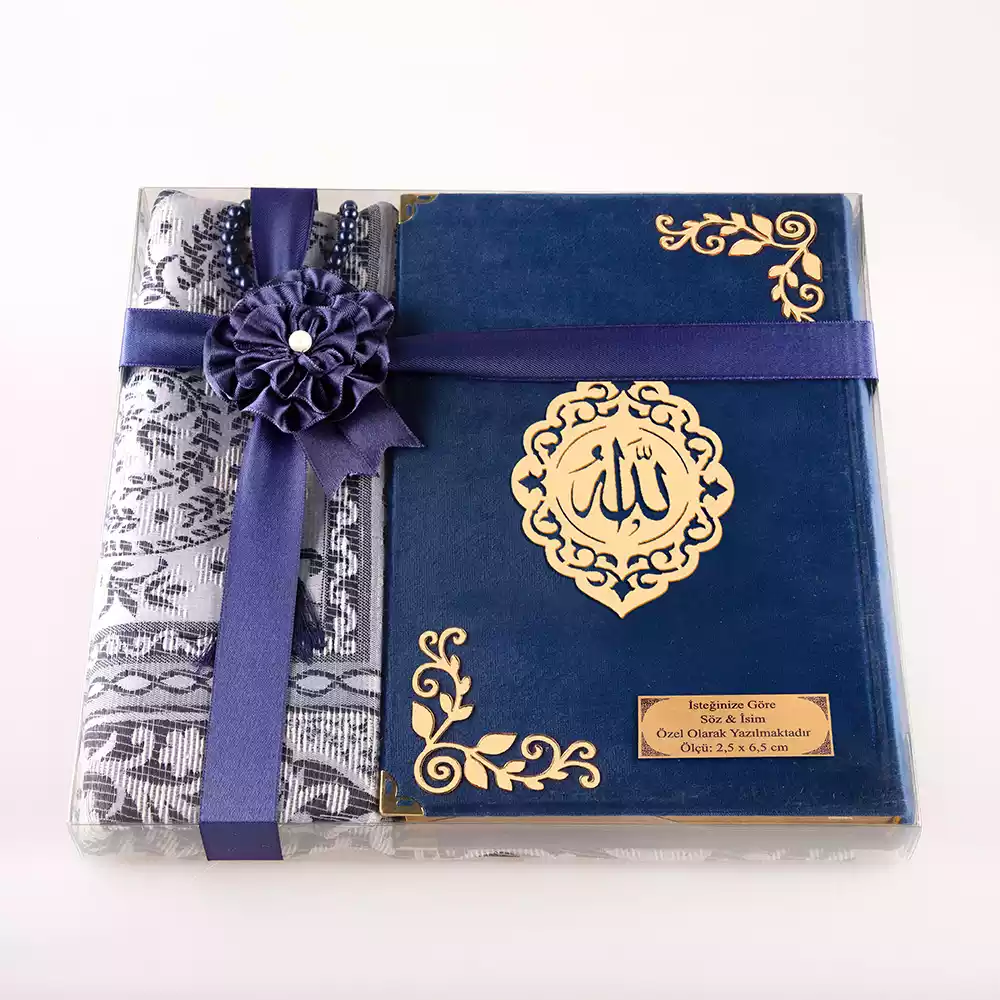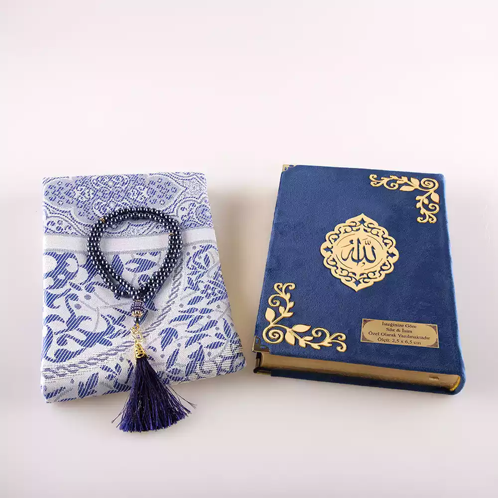 Seccade + Tesbih + Kuran Hediye Seti (Orta Boy, Kadife, Lacivert, Lafzatullah)