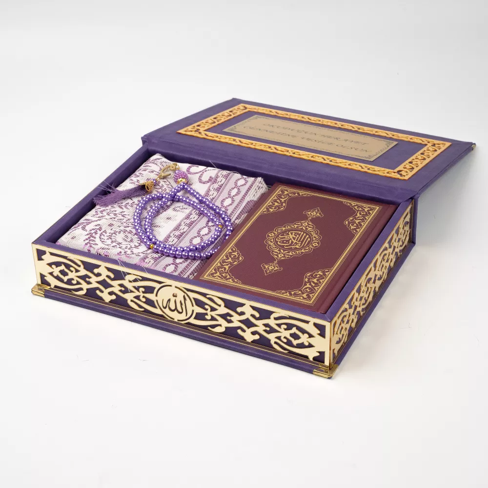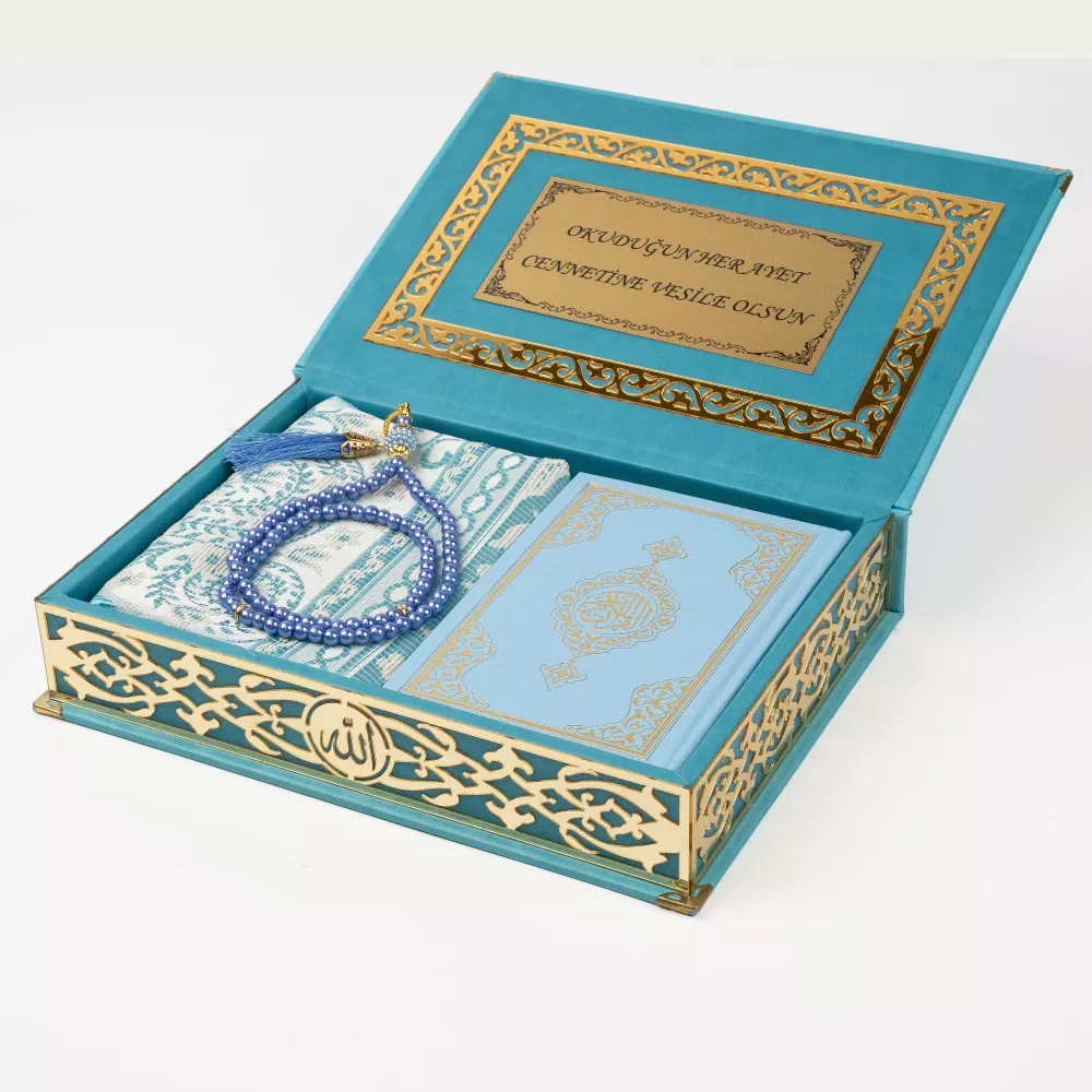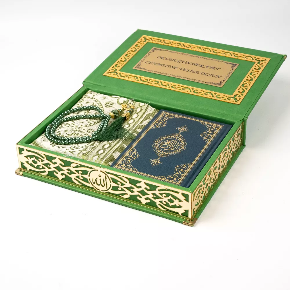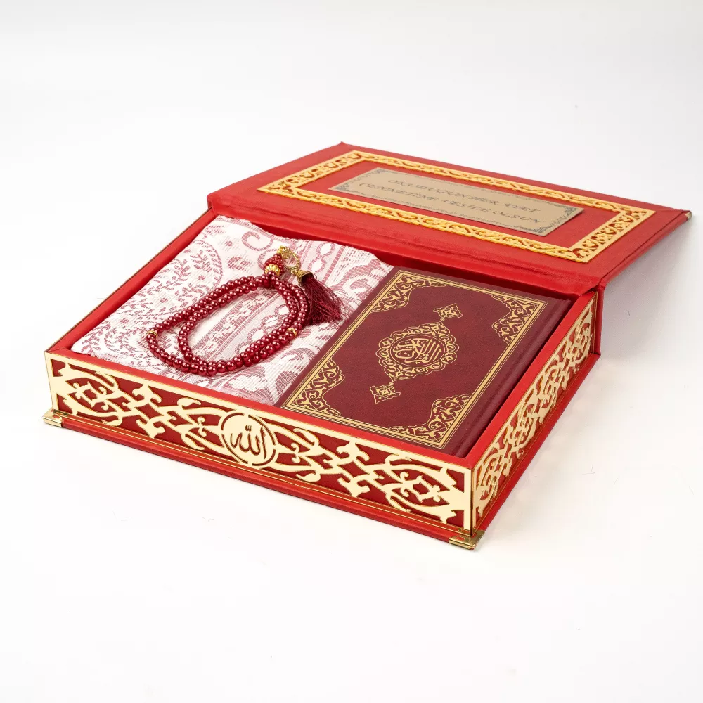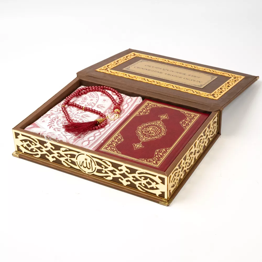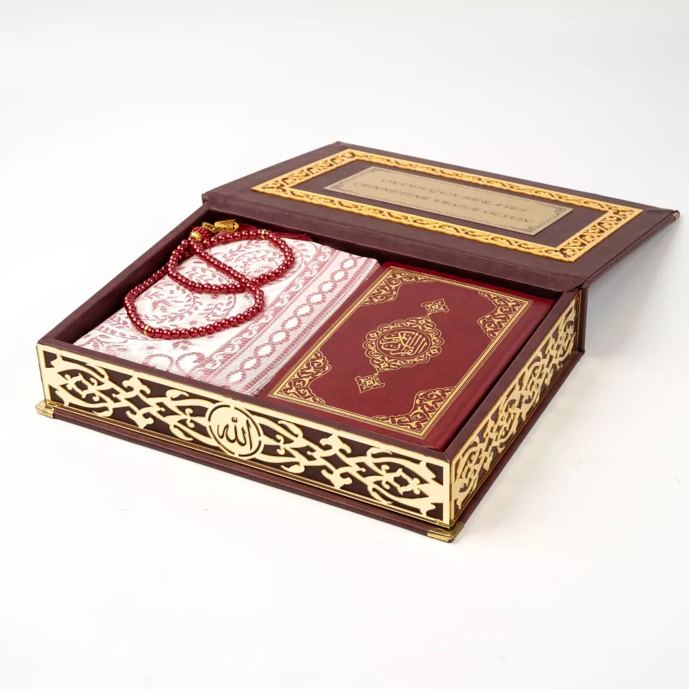 Seccade + Vavlı İnci Tesbih + Çanta boy Kuran Hediye Seti (Termo Deri Kutulu)