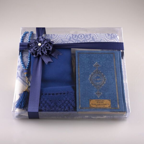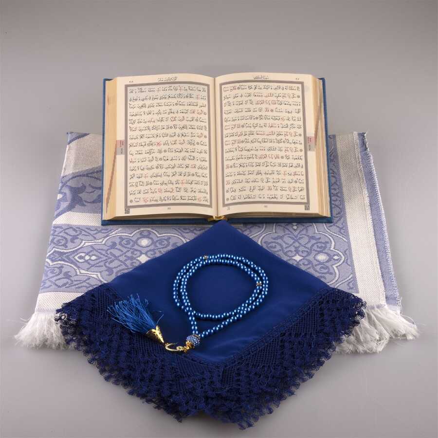 Shawl + Prayer Mat + Salah Beads + Quran Gift Set (Bag Size, Navy Blue)