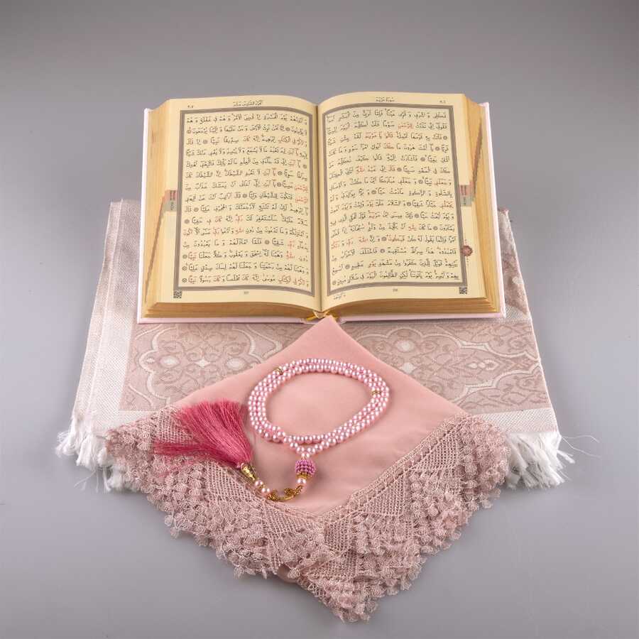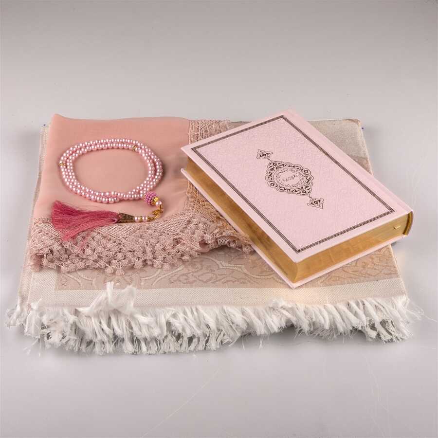Shawl + Prayer Mat + Salah Beads + Quran Gift Set (Hafiz Size, Powder Pink)