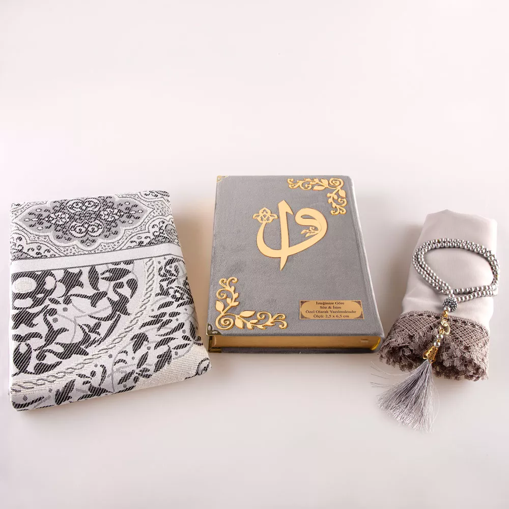 Shawl + Prayer Mat + Salah Beads + Velvet Bound Quran Gift Set (Medium Size, Grey)