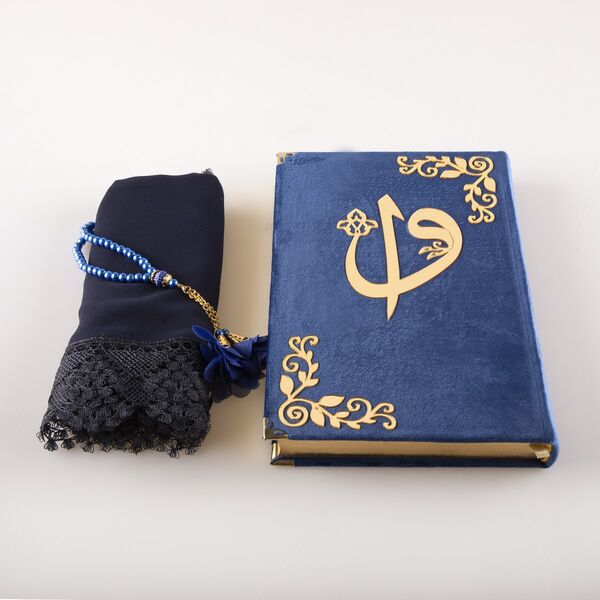 Shawl + Salah Beads + Quran Gift Set (Bag Size, Velvet, Navy Blue)