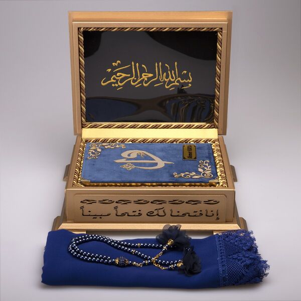 Shawl + Salah Beads + Quran Gift Set (Hafiz Size, Velvet, Navy Blue)