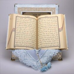 Shawl + Salah Beads + Quran Gift Set (Medium Size, Powder Blue, Gold Plexy)