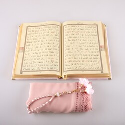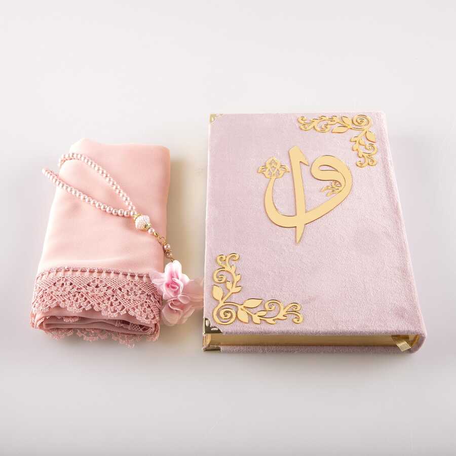 Shawl + Salah Beads + Quran Gift Set (Medium Size, Velvet, Powder Pink)