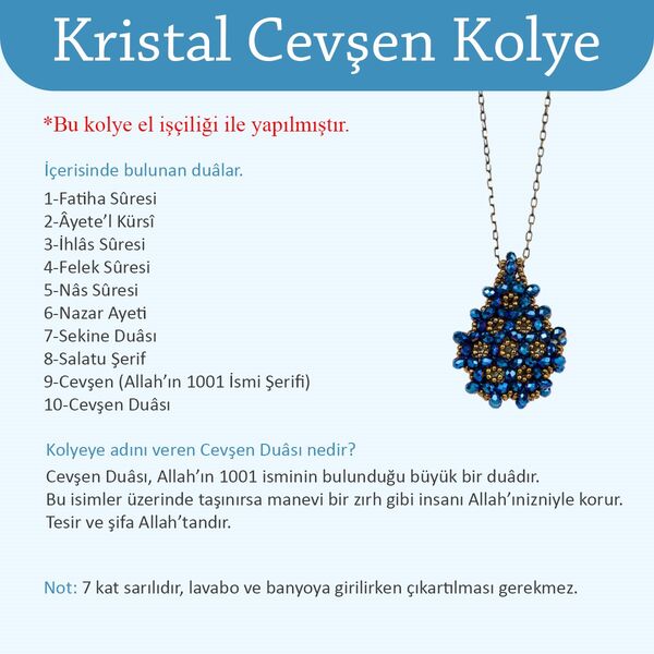 Bu kolyeye adını veren Cevşen Duası nedir?Cevşen Duası, Peygamberimiz (asm)’ın, Cenâb-ı Hakk’a bin bir ismiyle yaptığı azîm ve çok şümullü bir münâcâttır.