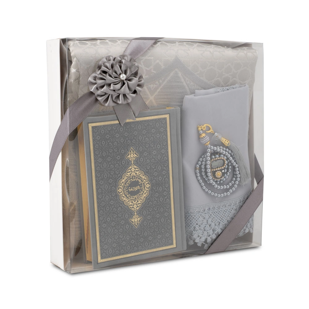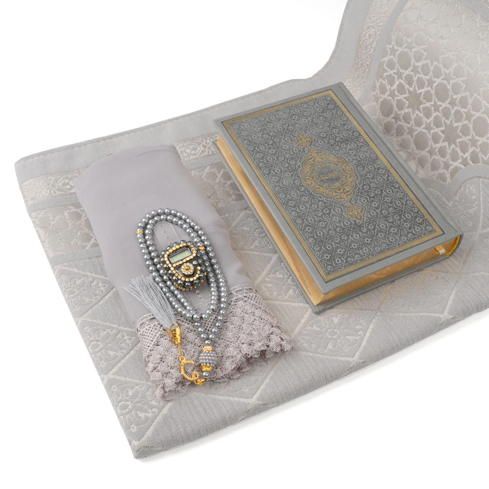 Şönil Seccade + Şal + Tesbih + Zikirmatik + Hafız Boy Kuran Hediye Seti (Gri)