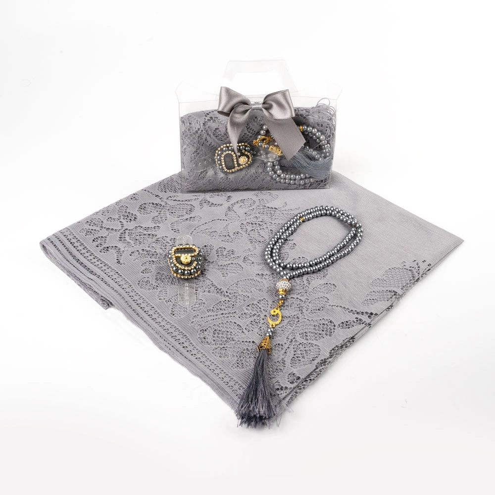 Tesbih + Dantelli Şal + Zikirmatik Hediye Seti (Asetat Kutulu, Gri)