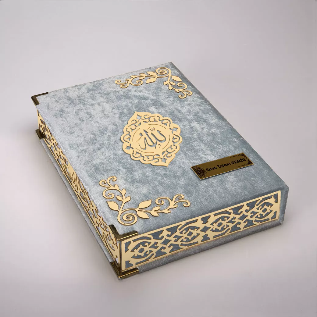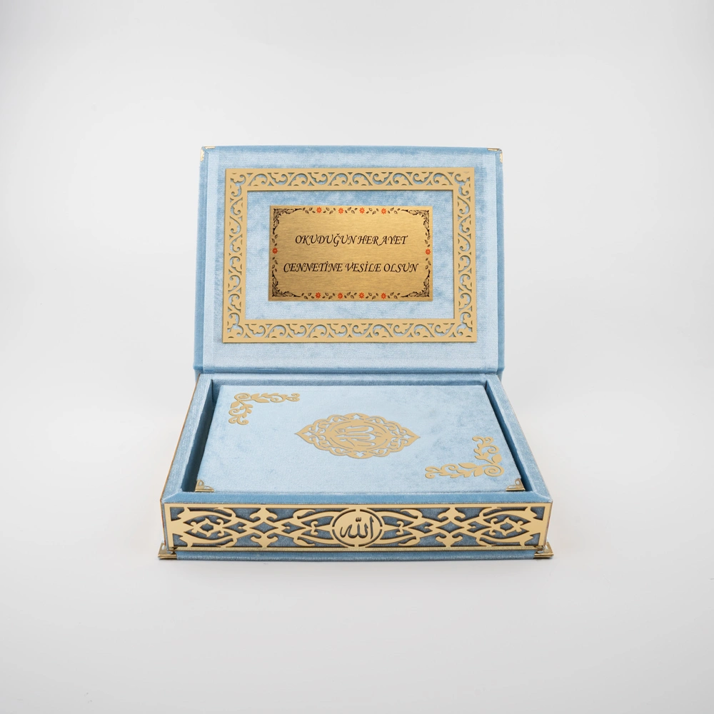 Raşel Kutulu Hediyelik Kuran-ı Kerim (Orta Boy, Bebe Mavi, Şems Lafzatullah Gold Pleksi)