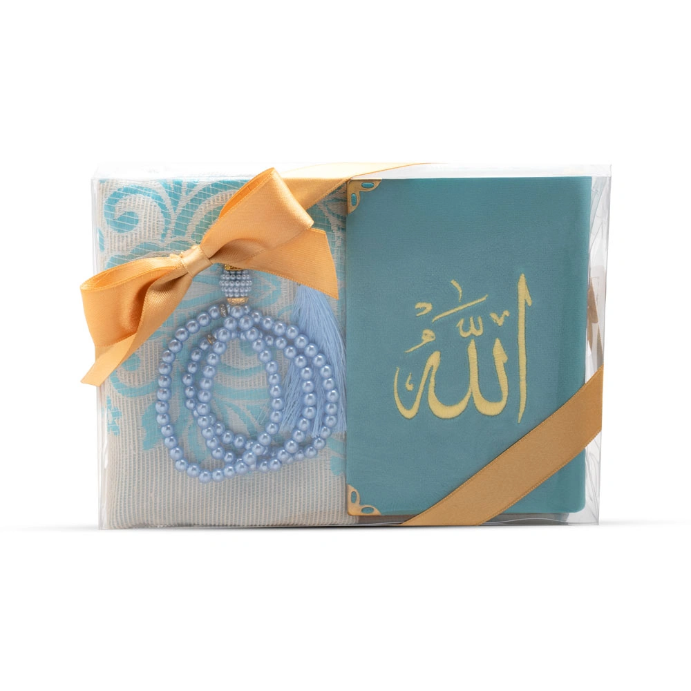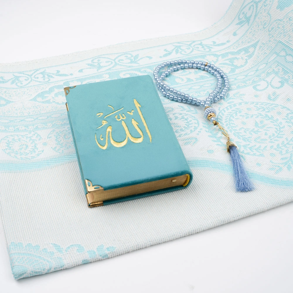 Tesbih + Seccade + Büyük Cep Boy Kadife Kuran Hediye Seti (Nakışlı, Turkuaz)