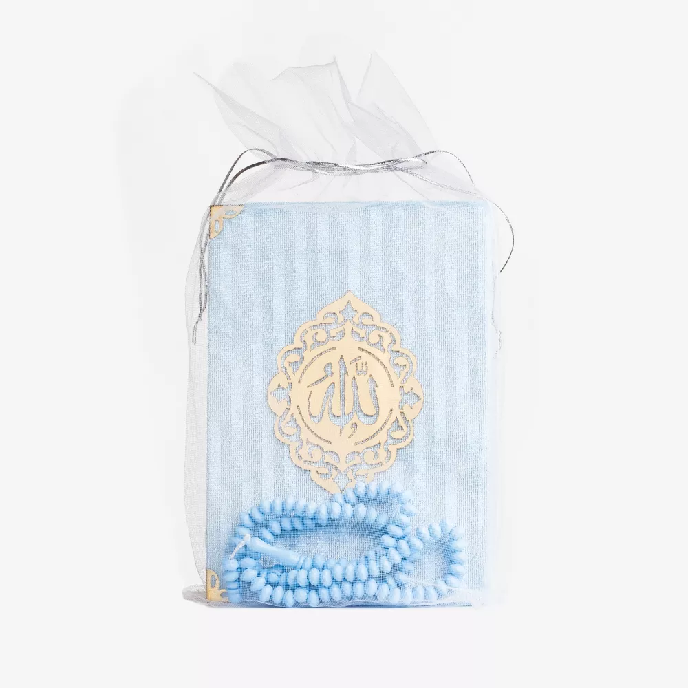 Gül Kokulu Tesbih + Yasin Hediye Seti (Çanta Boy, Lafzatullah, Tül Keseli, Bebe Mavi)